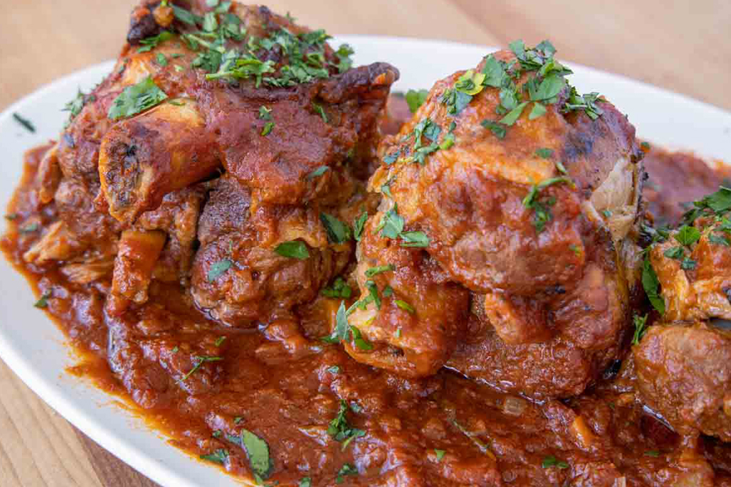 Serve pork shanks with plenty of sauce, garnished with parsley and lemon zest.